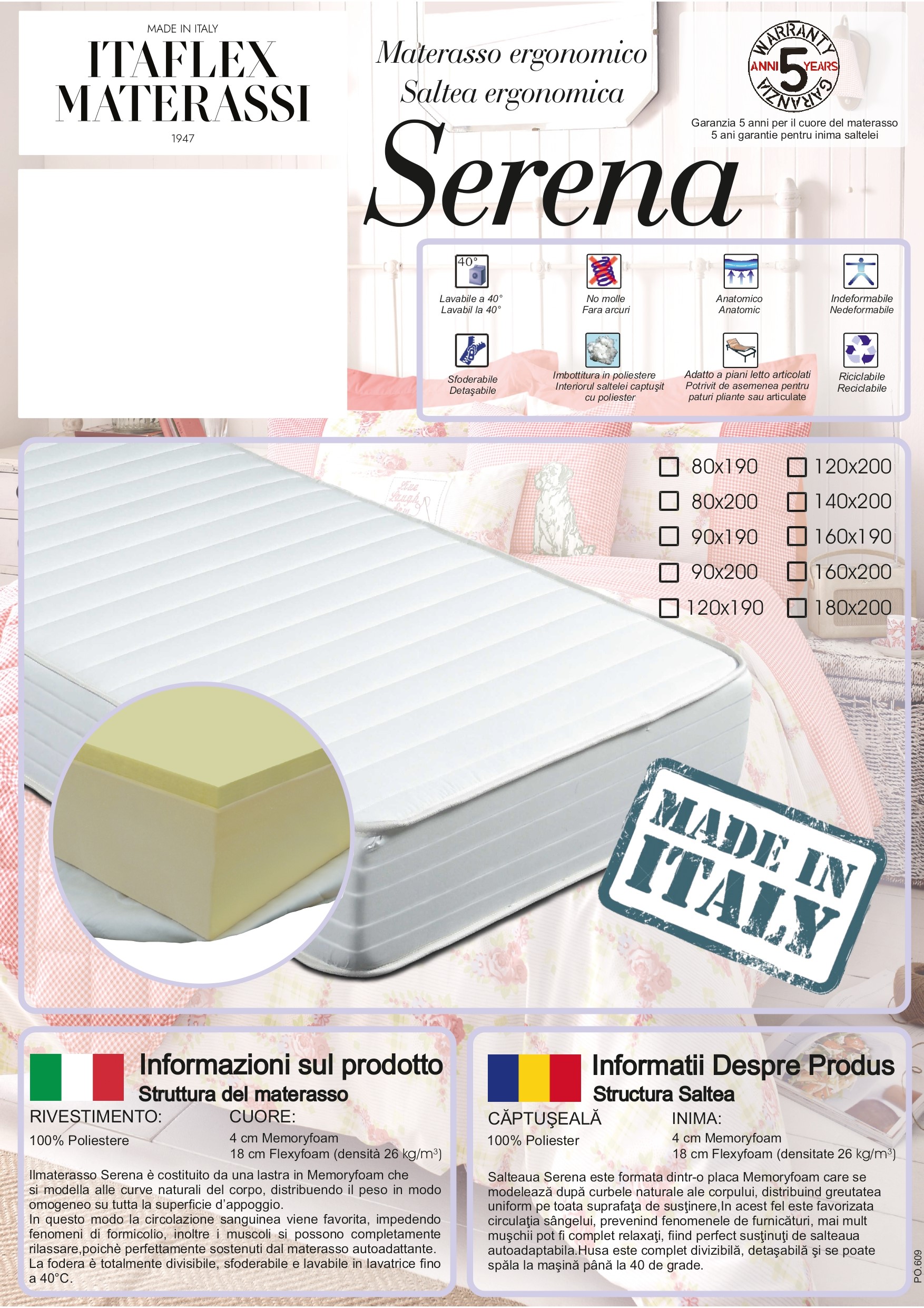 Saltea superortopedica Italflex Serena, cu spuma poliuretanica + spuma Memory, 80x200x24 cm inaltime, densitate26 kg/mc, Husa detasabila